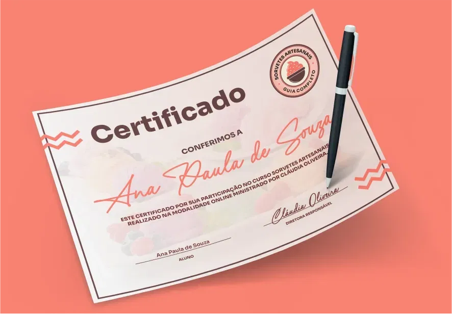 Receba um certificado exclusivo e mostre sua qualificação em sorvetes artesanais saudáveis, transformando aprendizado em lucro ou garantindo saúde e sabor para sua família!